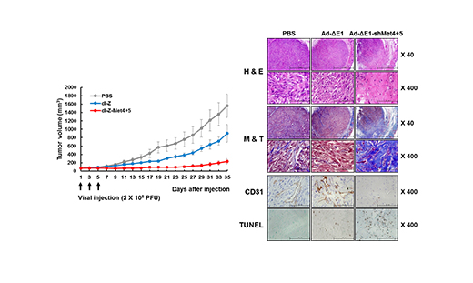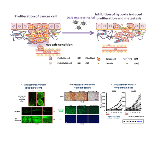 : By inserting tumor extracellular matrix degrading protein (decorin or relaxin) as therapeutic gene in an oncolytic adenovirus, an oncolytic adenovirus can selectively degrade tumor extracellular matrix and amends hypoxic conditions of tumor microenvironment, ultimately resulting in chemosenstization of tumor tissues (Int J Cancer. 2018 Jan 15;142(2):392-413, J Natl Cancer Inst. 2006 Oct 18;98(20):1482-93.)