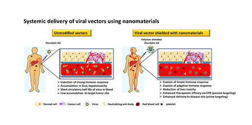 : Oncolytic adenovirus cannot be administered systemically due to its high immunogenicity. Even if oncolytic adenovirus is highly efficacious via local administration, clinical translation of any therapeutic requires potential to treat distant metastases. By masking the surface of immunogenic viral capsid with nanomaterials, immunogenicity and other side effects commonly associated with systemically administered oncolytic viruses can be overcome.