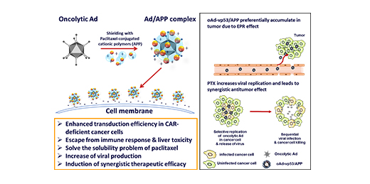 : Through the development of chemotherapeutic-conjugated nanomaterial, a polyplex containing oncolytic adenovirus and chemotherapeutic can concomitantly deliver both therapeutics to tumor tissues. As these therapeutics elicit antitumor effect through different mechanisms, a synergistic anticancer effect can be achieved (Biomaterials. 2017 Nov;145:207-222.)